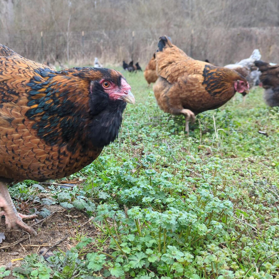 From dawn to dust, the chickens spend their days exploring and foraging..